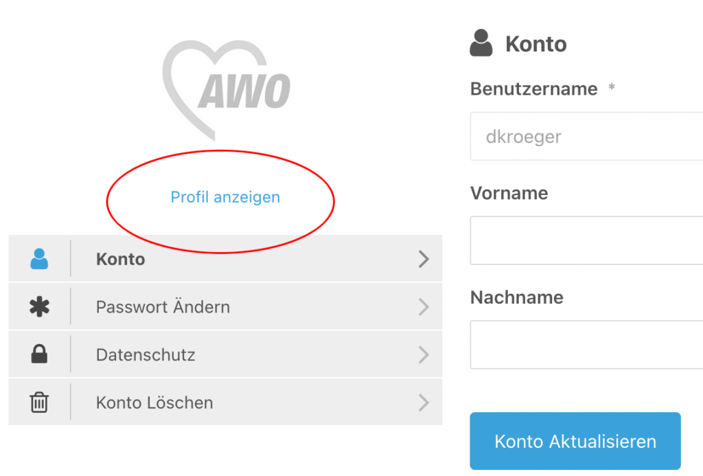 Oben rechts auf “Intern” und dann auf den Menüpunkt “Konto/ Profil” klicken