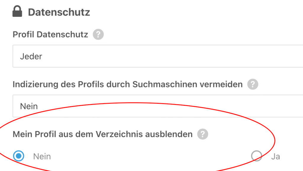 Bei der Postion “Mein Profil aus dem Verzeichnis ausblenden” Nein auswählen und unten mit “Datenschutz aktualisieren” bestätigen