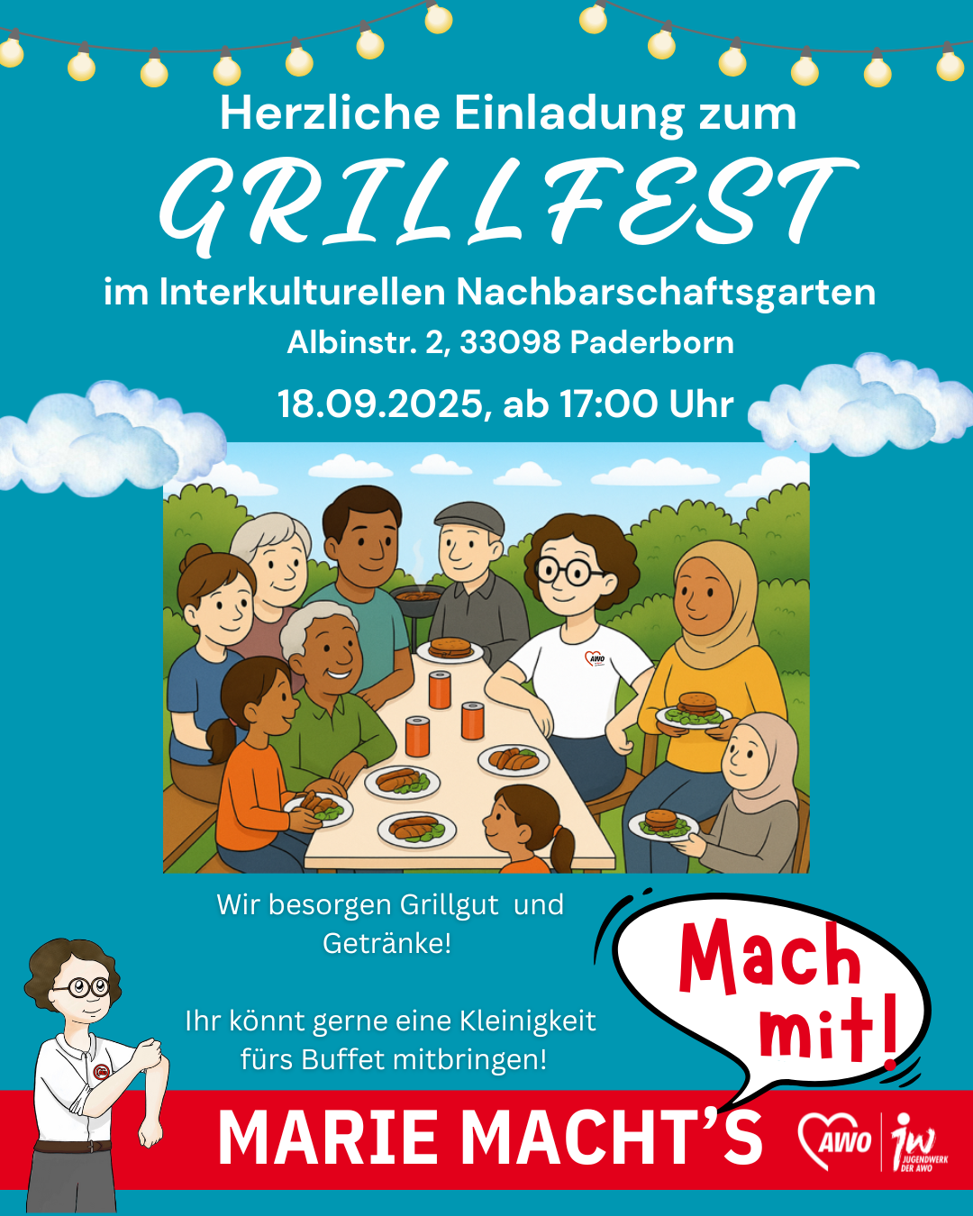 Am 18.09.2025 laden wir herzlich alle Nachbarn und Nachbarinnen, Familien, Jugendliche und Interessierte in unseren Interkulturellen Nachbarschaftsgarten zu einem gemeinsamen Grillfest ein. Gemeinsam möchten wir bei leckerem Essen ins Gespräch kommen, neue Begegnungen ermöglichen und die Vielfalt in unserer Nachbarschaft feiern.