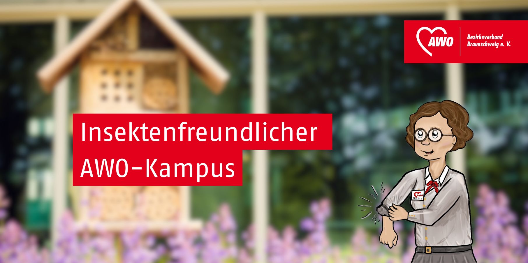 Insektenfreundlicher AWO-Kampus Die Stabsstellen der AWO-Bezirksgeschäftsstelle Braunschweig nutzen den Aktionstag „Marie macht’s“ um den AWO-Kampus Insektenfreundlicher zu gestalten. Es ist geplant ein Insektenhotel sowie ein Sandarium anzulegen. Route auf Google Maps