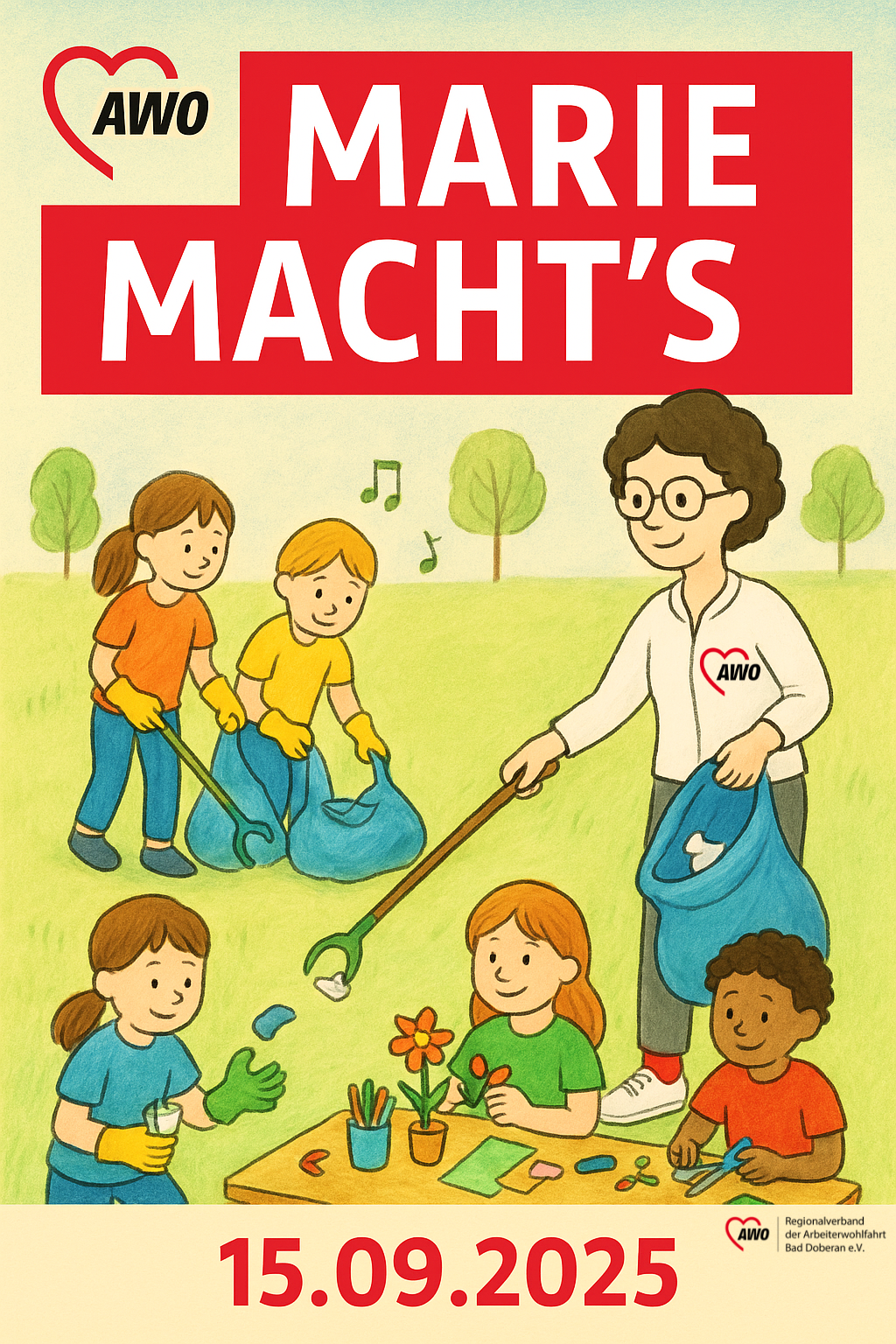 Am 15.09.2025 beteiligen sich die Kinder der AWO Kita „Uns Kinnerstuv“ in Rerik am bundesweiten Aktionstag Marie macht’s. Gemeinsam mit ihren Erzieherinnen sammeln sie Müll in ihrer Umgebung und gestalten anschließend kreative Bastelarbeiten zum Thema Nachhaltigkeit. So setzen die Kinder ein buntes Zeichen für Umweltschutz und zeigen, dass schon kleine Hände viel bewegen können.