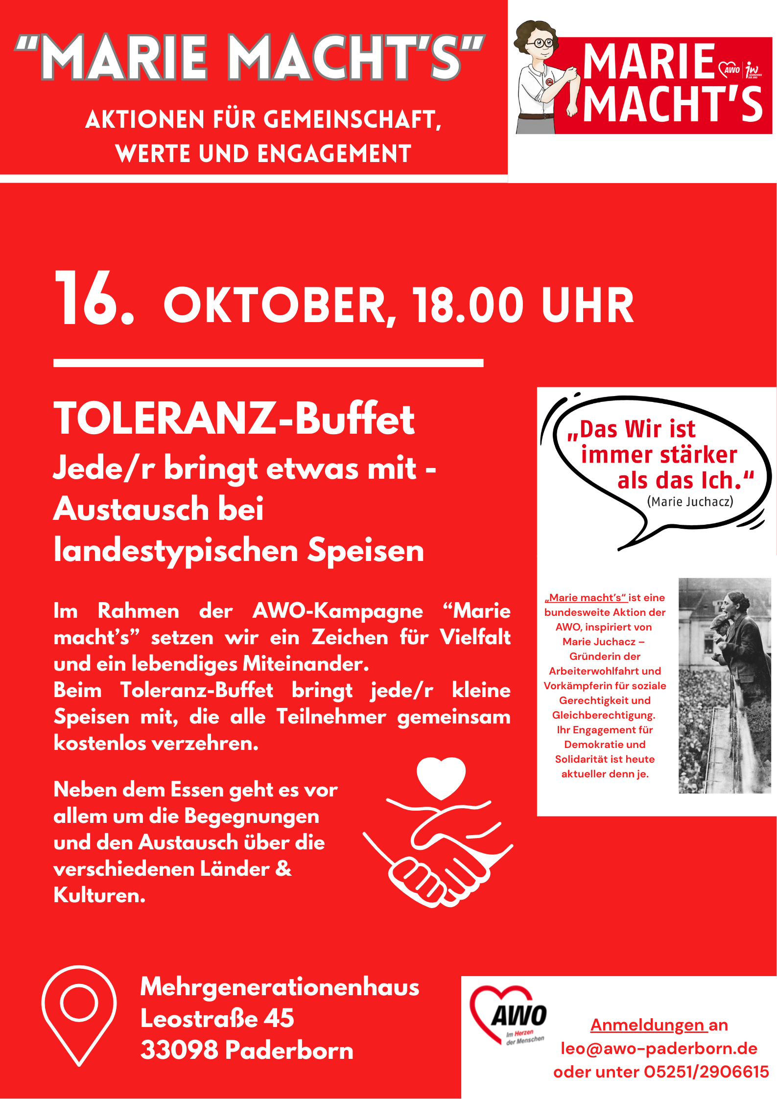 Im Rahmen der Kampagne "Marie macht's" setzen wir ein Zechen für Vielfalt und ein lebendiges Miteinander. Beim Toleranz-Buffet bringt jede/r landestypische Speisen mit, die dann gemeinsam verzehrt werden. Begegnungen und Austausch über die verschiedenen Länder und Kulturen stehen im Mittelpunkt.