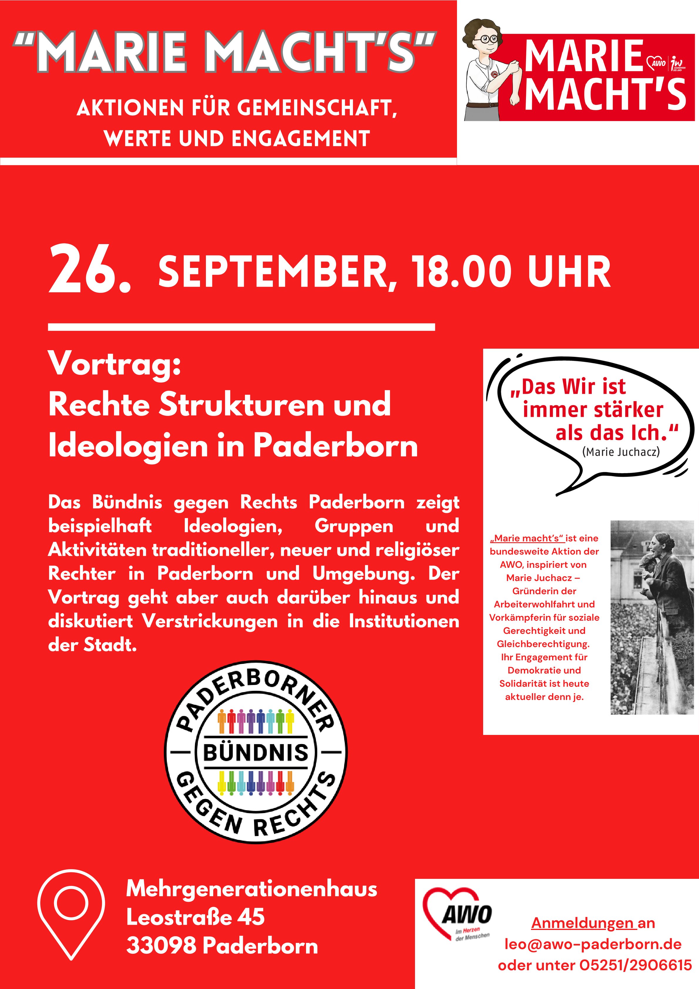Das Paderborner Bündnis gegen Rechts zeigt beispielhaft Ideologien, Gruppen und Aktivitäten traditioneller, neuer und religiöser Rechter in Paderborn und Umgebung. Es schließt sich eine Diskussionsrunde an.